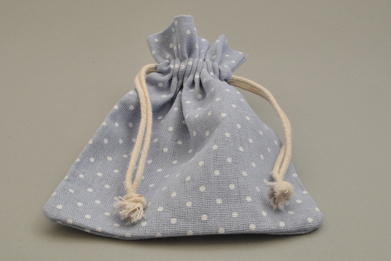 Πουγκί υφασμάτινο γαλάζιο με λευκά πουά και κλείσιμο με κορδόνι. Ιδανικό για συσκευασία δώρου καθώς και μία πολύ όμορφη πρόταση για μπομπονιέρα βάφτισης που θα εντυπωσιάσει τους καλεσμένους σας.