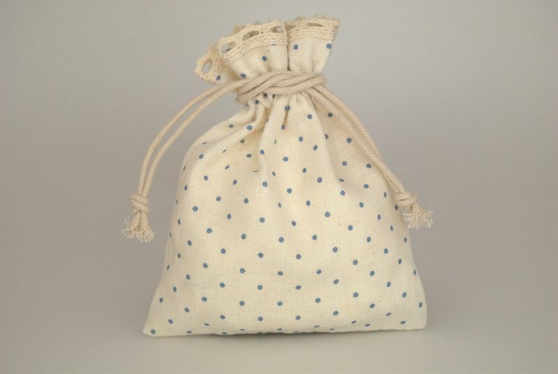Πουγκί υφασμάτινο εκρού με γαλάζιο πουά, δαντέλα στο τελείωμα και κλείσιμο με κορδόνι. Ιδανικό για συσκευασία δώρου καθώς και μία πολύ όμορφη πρόταση για μπομπονιέρα βάφτισης ή για οποιαδήποτε άλλη χρήση μπορεί να σας οδηγήσει η έμπνευσή σας.
