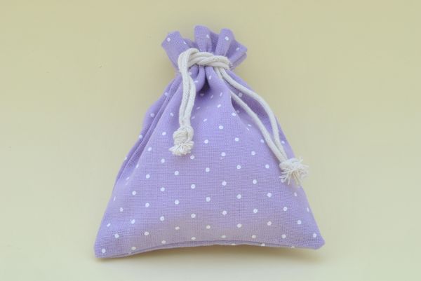 Πουγκί υφασμάτινο λιλά με λευκά πουά και κλείσιμο με κορδόνι. Ιδανικό για συσκευασία δώρου καθώς και μία πολύ όμορφη πρόταση για μπομπονιέρα βάφτισης που θα εντυπωσιάσει τους καλεσμένους σας.