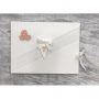 Βιβλίο ευχών για γάμο σε παραλληλόγραμμο σχήμα και λευκό χρώμα. Η κεντρική ξύλινη καρδιά σε συνδυασμό με λουλούδια σε απαλούς τόνους του ροζ και τη λευκή δαντέλα που στολίζει τα εξώφυλλα του βιβλίου δημιουργούν ένα λιτό και συνάμα εντυπωσιακό αποτέλεσμα. Την εικόνα του βιβλίου ολοκληρώνει το όμορφο κλείσιμο με την βαμβακερή δαντέλα.