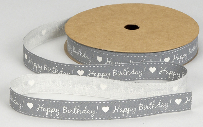 Κορδέλα υφασμάτινη σε γκρι χρώμα με σχέδια καρδιές και τύπωμα happy birthday. Μία πολύ ξεχωριστή και ιδιαίτερη κορδέλα που μπορείτε να την χρησιμοποιήσετε για τις κατασκευές σας, την διακόσμηση του πάρτι σας ή ακόμη και στην βάφτιση ή τον γάμο σας δίνοντας μία διαφορετική πινελιά στην εκδήλωσή σας.