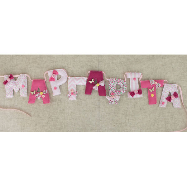 Υφασμάτινη χειροποίητη κατασκευή με κρεμαστά γράμματα στις αποχρώσεις του ροζ, του φούξια και του φλοράλ. Τα γράμματα είναι ραμμένα σε κορδέλα και διακοσμημένα με υφασμάτινα φιογκάκια, πεταλούδες και κουμπιά. Η κατασκευή χρησιμοποιείται τόσο για την διακόσμηση της βάπτισης όσο και του παιδικού δωματίου. Το ύψος των γραμμάτων είναι στα 10 εκατοστά.