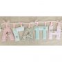 Υφασμάτινη χειροποίητη κατασκευή με κρεμαστά γράμματα στις αποχρώσεις του ροζ, του φούξια και του φλοράλ. Τα γράμματα είναι ραμμένα σε κορδέλα και διακοσμημένα με υφασμάτινα φιογκάκια, πεταλούδες και κουμπιά. Η κατασκευή χρησιμοποιείται τόσο για την διακόσμηση της βάπτισης όσο και του παιδικού δωματίου. Το ύψος των γραμμάτων είναι στα 10 εκατοστά.