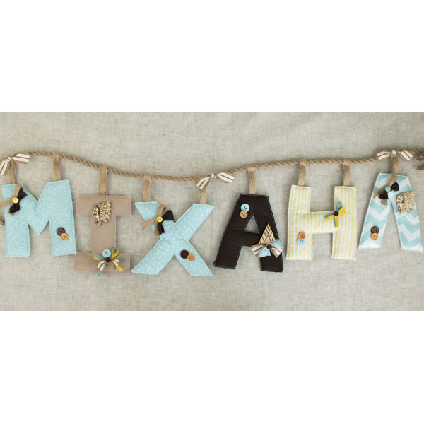 Υφασμάτινη χειροποίητη κατασκευή με κρεμαστά γράμματα στις αποχρώσεις του μπλε, μπεζ, κίτρινου και σιέλ. Τα γράμματα κρέμονται από χοντρό κορδόνι και είναι διακοσμημένα με φιογκάκια, κουμπιά και ξύλινα στοιχεία με θέμα τους ινδιάνους. Το ύψος των γραμμάτων είναι στα 15 - 16 εκατοστά.