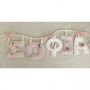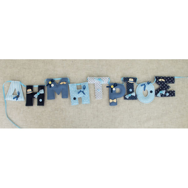 Υφασμάτινη χειροποίητη κατασκευή με κρεμαστά γράμματα στις αποχρώσεις του μπλε, του μπλε σκούρου και του σιέλ. Τα γράμματα είναι ραμμένα σε κορδέλα και διακοσμημένα με υφασμάτινα φιογκάκια, κουμπιά και ξύλινα στοιχεία. Η κατασκευή χρησιμοποιείται τόσο για την διακόσμηση της βάπτισης όσο και του παιδικού δωματίου. Το ύψος των γραμμάτων είναι στα 10 εκατοστά.