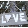 Ξύλινη ταμπέλα κρεμαστή LOVE σε γκρι απόχρωση με πάνινη καρδιά. Μία όμορφη πρόταση για ντεκόρ γάμου και αρραβώνα.